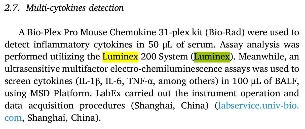 (2)使用MSD超灵敏多因子电化学发光技术检测来100微升支气管肺泡灌洗液(BALF)中的细胞因子(如IL-1β、IL-6、TNFα等)。