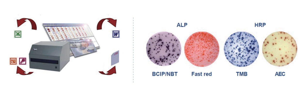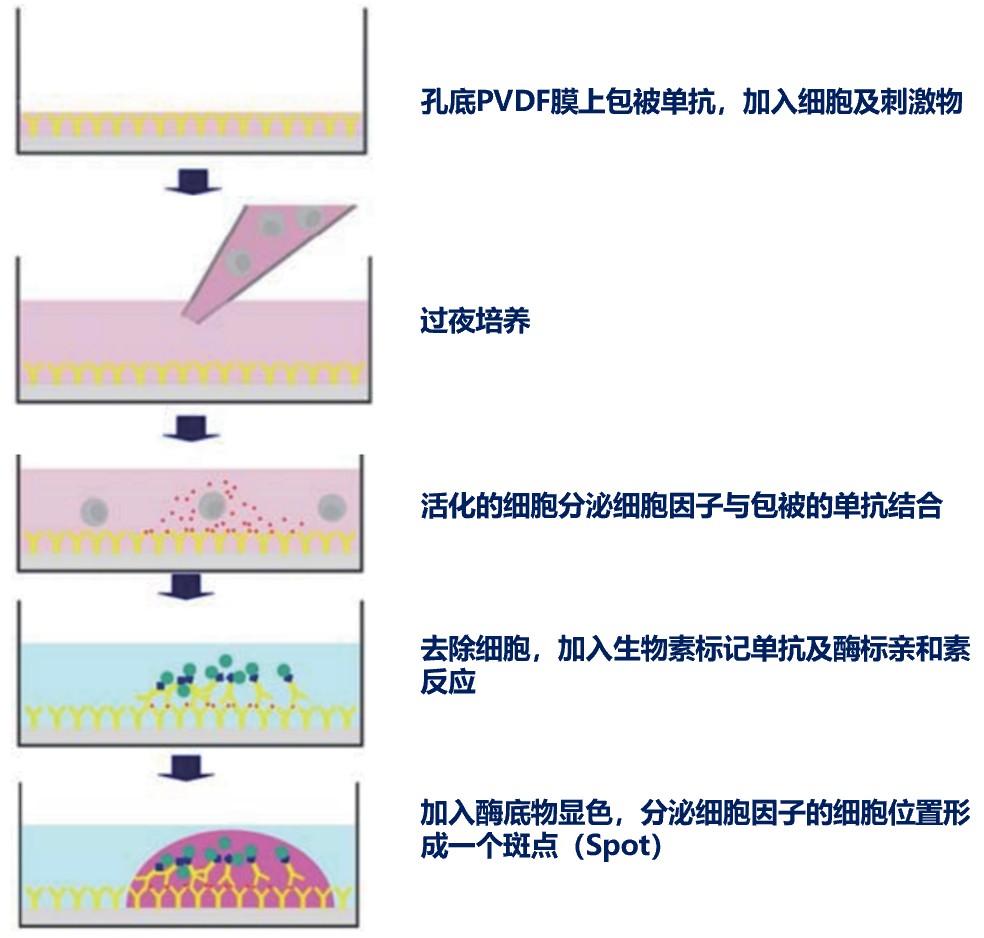 直观、可信度高:一个阳性细胞一个斑点,斑点数量代表分泌细胞因子的细胞数量多少,斑点大小代表该细胞分泌细胞因子水平的多少。