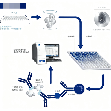 Luminex xMAP技术是一种基于悬浮阵列的多重免疫分析平台,其核心原理结合了流式细胞术、荧光编码与数字信号处理技术,广泛应用于生物医学研究与临床检测领域。
