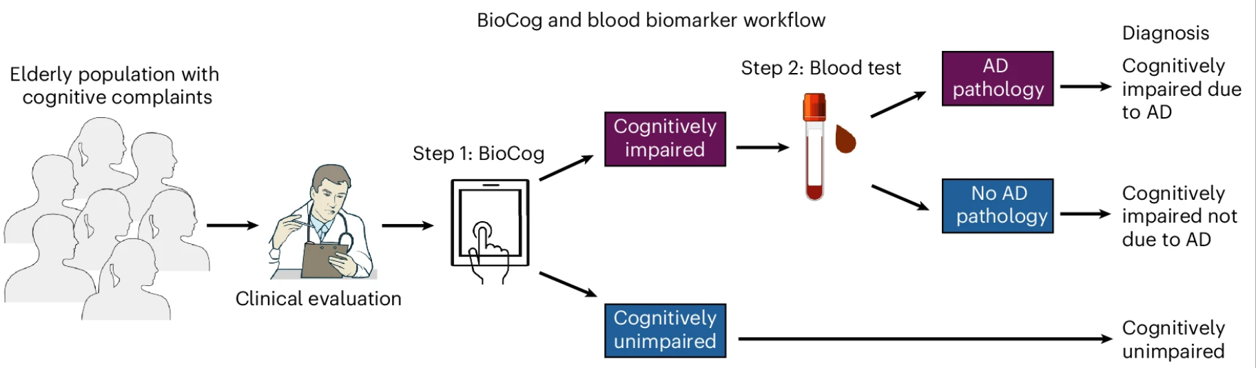 近期发表于《Nature Medicine》(IF=50)的研究提出了一项创新性的诊断策略,将自我管理式数字认知测试(BioCog)与血液生物标志物检测相结合。该方案首先通过BioCog进行初步筛查,该测试仅需十余分钟,并具备自动化评分功能,有效排除人为偏倚,筛查准确率达到85%,显著优于传统简易精神状态检查(MMSE)。