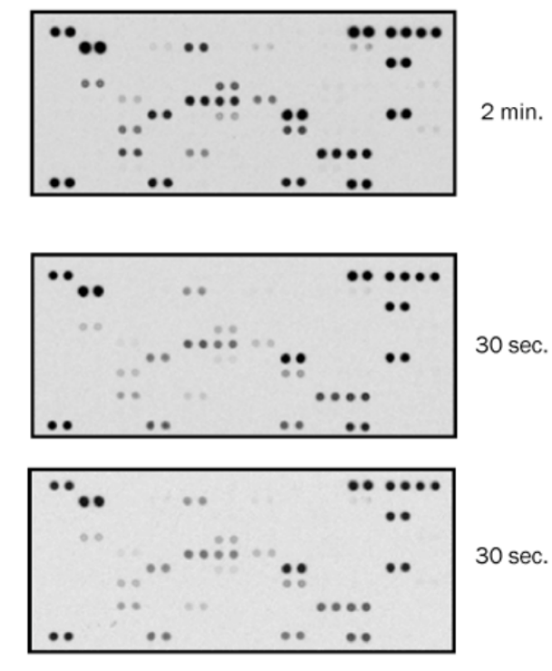 答:不会。在可视化处理阶段,我们常常需要对曝光条件进行摸索和调试,这就要求芯片结果具有较高的信号稳定性,方便操作者把握实验节奏。现在的抗体芯片产品使用高特异性的抗体、经优化的缓冲液以及可靠的化学发光反应系统能提供更稳定的信号,可用于多次连续曝光,成像出理想的实验结果。