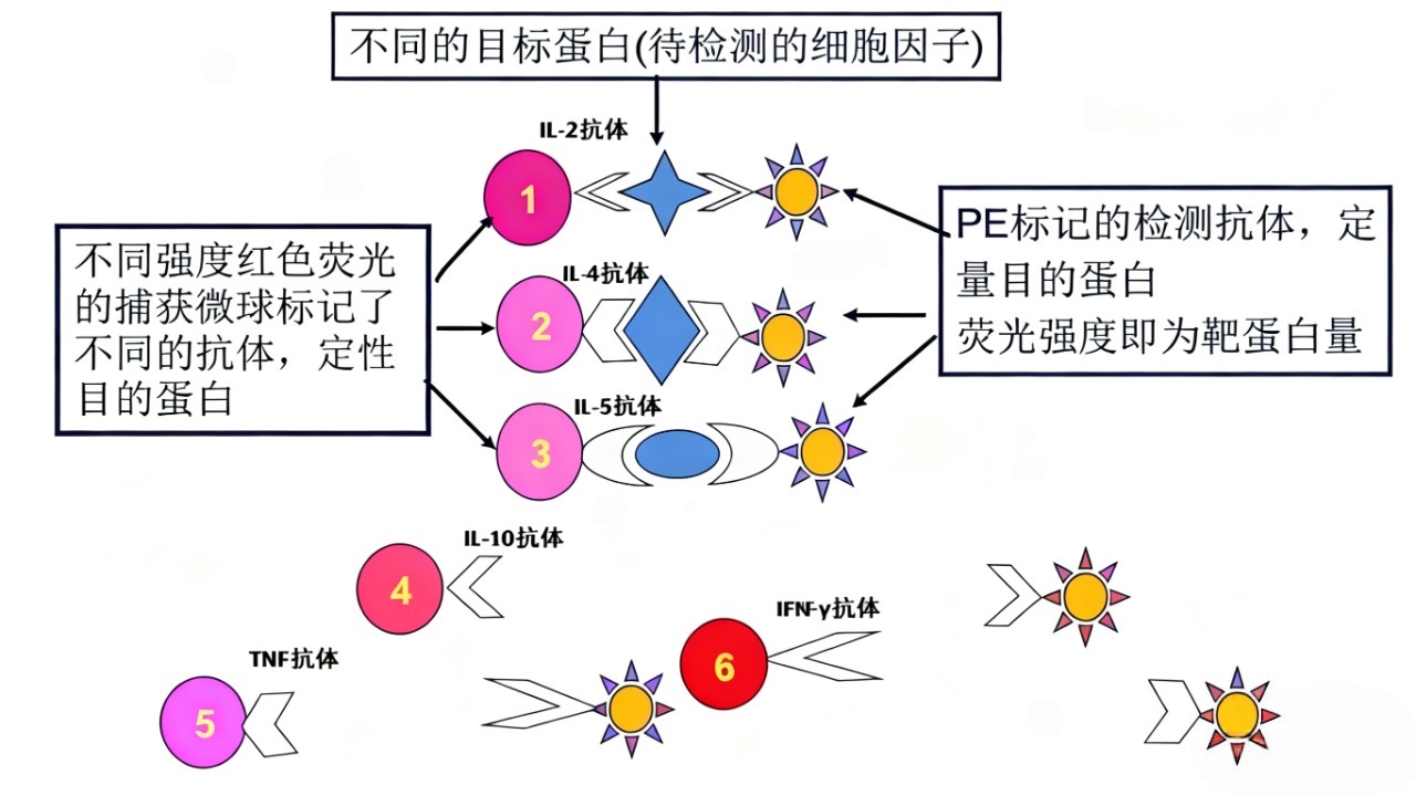 通过流式细胞仪分析,系统可同时识别微球编码荧光和检测荧光信号,实现对待测样本中多个蛋白指标的同步定量。每个荧光编码微球相当于一个独立的检测单元,其检测原理类似于传统ELISA,但凭借流式细胞仪的高灵敏荧光检测能力,显著提升了检测性能。