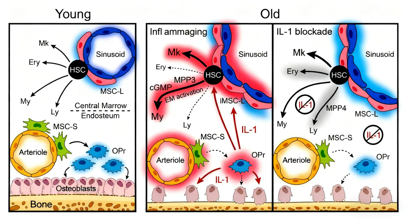 随着年龄增长,机体出现的异常衰老过程会打破炎症平衡,导致慢性炎症状态的形成。在这种背景下,骨髓生态位中IL-1β信号通路的持续激活会引起多能造血干细胞功能障碍,进而影响免疫细胞的分化和功能,为肿瘤发生创造有利条件。