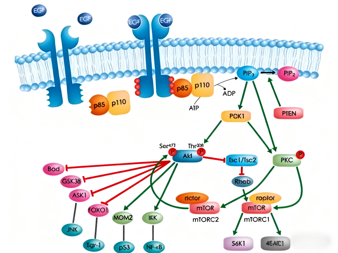 PTEN:作为该通路的关键负调控因子,可通过去磷酸化PIP3,将其还原为PIP2,从而终止PI3K介导的下游信号传导,是重要的抑癌蛋白。