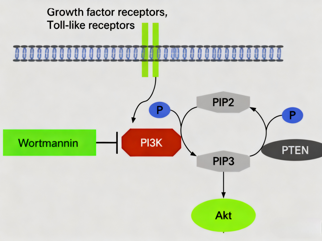 PI3K:即磷脂酰肌醇3-激酶,通常为由调节亚基p85和催化亚基p110构成的异源二聚体。其激活可将细胞膜上的磷脂酰肌醇二磷酸转化为第二信使——磷脂酰肌醇三磷酸,从而启动下游信号级联反应。