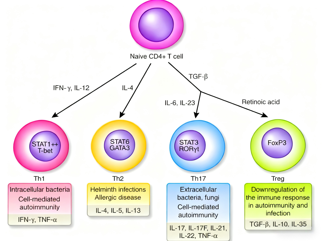 Th2和Th17细胞是CD4+T细胞的重要亚群,在免疫调节中发挥核心作用。Th2细胞主要分泌IL-4、IL-5、IL-13等细胞因子,参与过敏反应和抗寄生虫免疫;Th17细胞则主要产生IL-17、IL-22等,在防御胞外菌感染和自身免疫疾病中起关键作用。两者的平衡失调与多种疾病状态密切相关:Th2过度活化见于过敏性哮喘、特应性皮炎等;Th17异常增殖则与银屑病、类风湿关节炎等自身免疫疾病相关。