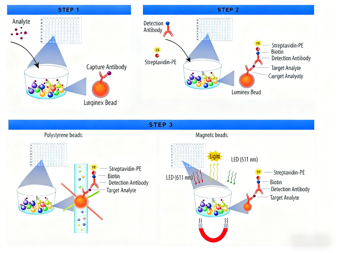 2.探针包被技术:在每个微球表面共价结合特异性捕获抗体,形成独立的检测单元