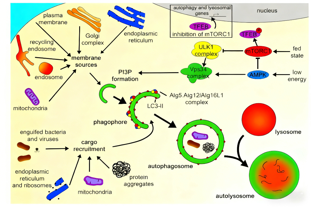 细胞自噬(autophagy)是一种进化上高度保守的细胞内降解系统,通过溶酶体途径降解受损细胞器和大分子物质,维持细胞内环境稳态。根据底物运输方式的不同,自噬可分为巨自噬、微自噬和分子伴侣介导的自噬三种类型。其中,巨自噬是最主要的研究形式,其过程包括自噬体的形成、运输及与溶酶体的融合。