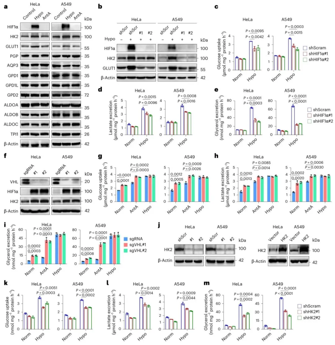 - HIF1α敲低可抑制GLUT1(葡萄糖转运体)与HK2(己糖激酶)的表达,显著降低葡萄糖摄取及甘油排泄;