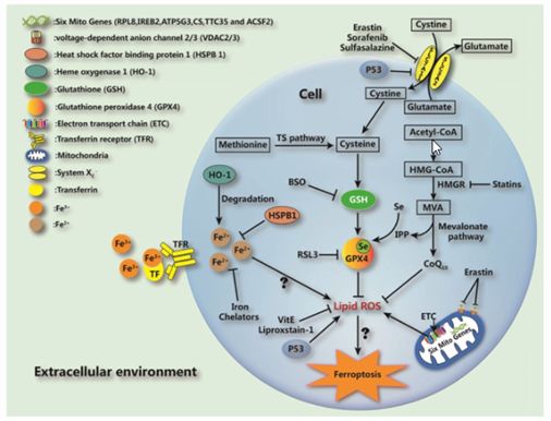 2、生物学特征:铁死亡的核心生物学表现为细胞内铁离子与活性氧(ROS)大量聚集,进而激活丝裂原活化蛋白激酶(MAPK)信号系统。其关键调控环节包括:抑制胱氨酸-谷氨酸交换体(system Xc⁻)降低胱氨酸摄取,导致谷胱甘肽(GPX4的关键底物)耗竭;同时升高还原型烟酰胺腺嘌呤二核苷酸磷酸(NADPH)氧化酶活性,促进ROS生成;此外还会释放花生四烯酸等炎症相关介质,放大死亡信号。