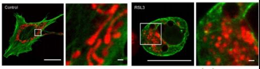 (3)线粒体形态动态观察:向细胞内转染 LifeAct-GFP 荧光蛋白,结合有丝分裂追踪器,实时观察铁死亡过程中线粒体的形态演变