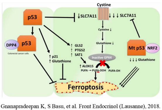 研究表明,不同肿瘤对铁死亡的敏感性存在显著差异,其中肾癌、白血病对铁死亡的敏感性显著高于肺癌、结肠癌等实体瘤。 p53作为经典抑癌基因,以往研究多聚焦其通过诱导细胞衰老、程序性凋亡抑制肿瘤的核心作用;而近年研究揭示,p53在调控细胞代谢及铁死亡过程中同样扮演关键角色:在正常细胞中,p53可负向调控脂质合成与糖酵解通路,同时正向调控氧化磷酸化及脂质分解代谢,这种代谢调控模式使其倾向于正向诱导铁死亡;而肿瘤细胞中常见的突变型p53则呈现功能逆转,通过正向调控脂质合成与糖酵解,显著增强肿瘤细胞对铁死亡的敏感性。这一发现为靶向铁死亡的肿瘤治疗提供了重要理论支撑,尤其为携带p53突变的肿瘤治疗开辟了新方向。