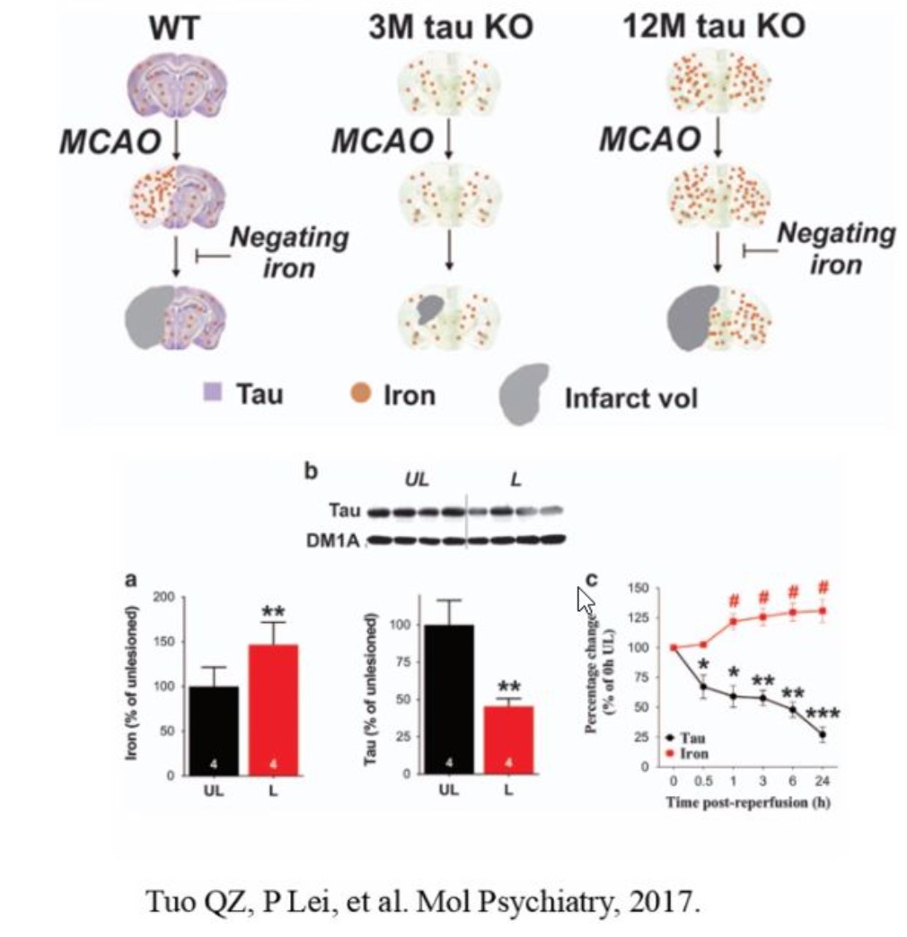 在缺血性脑卒中的病理进程中,Tau蛋白功能失调被证实与年龄依赖性铁介导的神经毒性密切相关。研究发现,大脑中动脉阻塞(MCAO)模型可显著抑制3月龄小鼠脑半球的Tau蛋白功能,并导致脑内铁离子水平异常升高;而在野生型小鼠中,通过铁螯合剂干预可有效阻断铁离子升高,提示Tau蛋白可能通过调控铁稳态发挥抑制铁死亡的保护作用。 进一步研究显示,12月龄Tau基因敲除小鼠中出现了明显的年龄依赖性铁积累,这一现象直接抵消了Tau敲除本身对MCAO诱导的局灶性脑缺血再灌注损伤的保护效应,从正反两方面证实了Tau蛋白通过调控铁死亡通路参与缺血性脑卒中病理机制的核心作用。