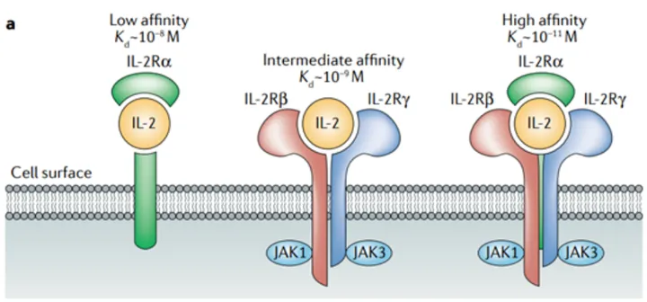 | 高亲和力受体 | α 链 +β 链 +γ 链(CD25+CD122+CD132) | 10⁻¹¹ M | 调节性 T 细胞(Treg)、活化 T 细胞 | 响应低浓度 IL-2,维持 Treg 存活与功能 |
