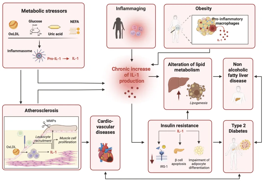 IL-1β是代谢紊乱与心血管疾病的关键纽带。肥胖、高血糖等代谢应激可激活炎性小体,导致IL-1β持续升高,通过抑制胰岛素受体底物1(IRS-1)磷酸化引发胰岛素抵抗,促进2型糖尿病发生。同时,IL-1β可促进肝细胞脂质新生,加速非酒精性脂肪肝病(NAFLD)进展;在动脉粥样硬化中,IL-1α、IL-1β和IL-18通过促进内皮细胞活化、平滑肌细胞增殖及斑块不稳定,加剧血管损伤。 IL-18在代谢平衡中具有双重作用,其缺乏会导致食欲调节异常和肥胖,但过度激活则会促进动脉粥样硬化。IL-33和IL-37则展现出保护作用,IL-33可通过激活ILC2细胞增强胰岛素分泌,IL-37则减轻脂肪组织炎症,改善胰岛素抵抗。