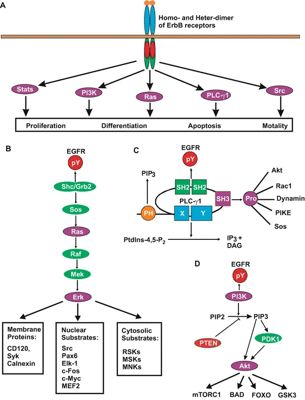 ErbB家族,又称表皮生长因子受体家族,是一类重要的受体酪氨酸激酶,包含四个成员:ErbB1、ErbB2、ErbB3 和 ErbB4(分别对应Her1/EGFR、Her2/Neu、Her3与Her4)。这些受体通常通过形成同源或异源二聚体与配体结合,激活其胞内酪氨酸激酶结构域。激活后的受体可募集多种下游转接蛋白(如Grb2, Shc),进而启动MAPK/ERK、PI3K/Akt、JAK/STAT等核心信号通路,最终调控细胞的增殖、分化、迁移与存活等关键生命活动,成为横跨神经系统功能维持与肿瘤发生发展的核心信号调控网络。
