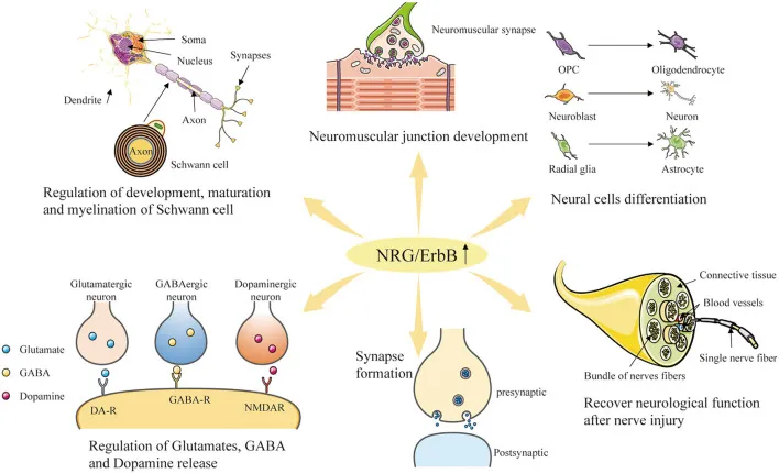 在神经系统中,ErbB信号通路扮演着不可或缺的角色,其对维持神经元存活、突触可塑性、胶质细胞功能及髓鞘形成与修复至关重要。大量研究证实,该家族受体(尤其是与神经保护密切相关的ErbB3和ErbB4)的表达水平下调或功能受损,与多种神经系统退行性病变的发生发展存在紧密关联。