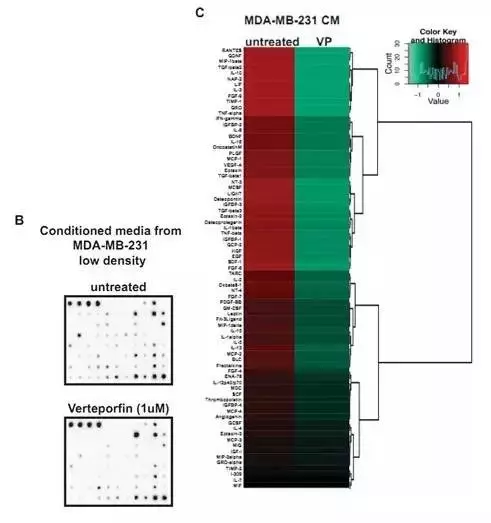 为系统探究YAP活性如何影响肿瘤细胞的分泌谱,进而调控血管侵袭行为,本研究采用抗体芯片技术对细胞培养上清进行无偏倚筛选。分别收集低密度培养的MDA-MB-231细胞经Vehicle(对照组)或YAP抑制剂Verteporfin(VP,实验组)处理后的上清液进行检测。