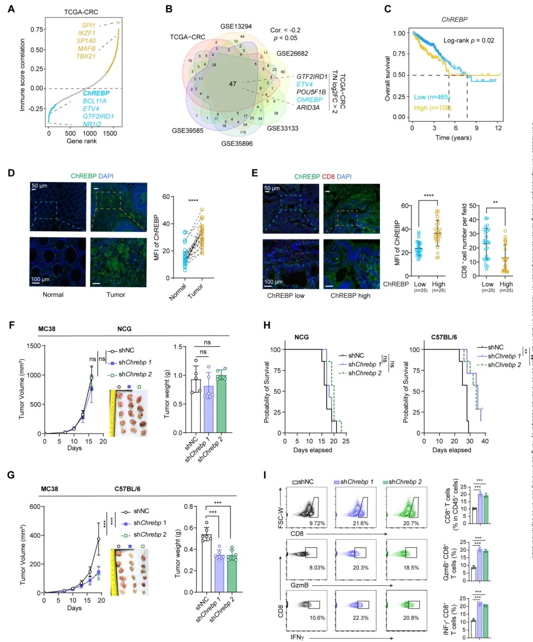 借助 TCGA-CRC 和 GEO-CRC 公共数据集,分析转录因子(TFs)与肿瘤免疫评分的相关性,筛选出 47 个与免疫评分负相关的 TFs,其中 8 个在结直肠癌(CRC)中高表达。进一步验证发现,仅 ChREBP 高表达与 CRC 患者不良预后呈显著关联;免疫荧光染色结果显示,CRC 组织中 ChREBP 表达水平显著高于癌旁正常组织,且 ChREBP 高表达组的 CD8⁺T 细胞浸润量明显降低,呈现 “免疫荒漠” 表型。该关联在其他肿瘤类型中也得到了验证,提示 ChREBP 的免疫调控作用具有普遍性。