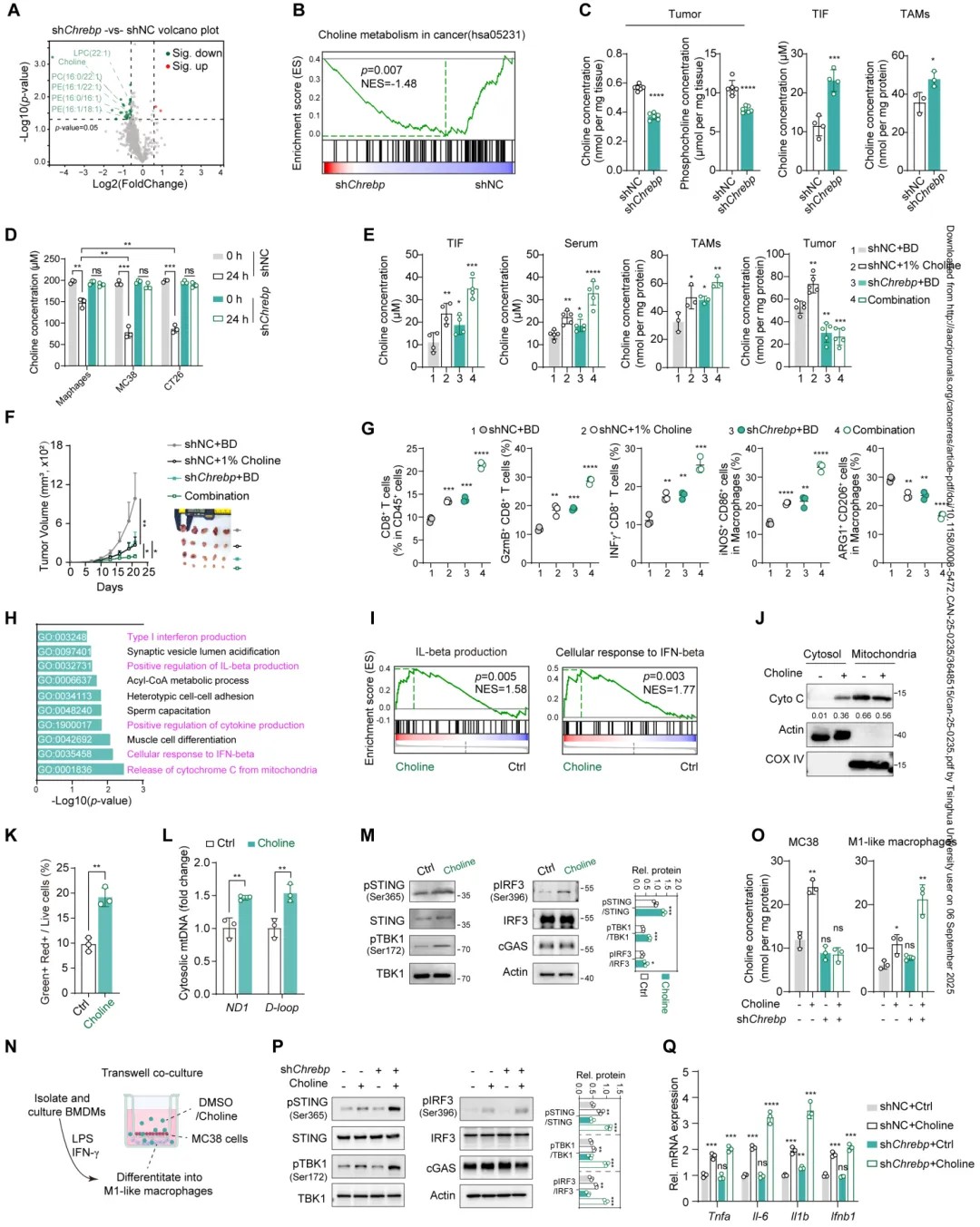体内实验表明,给荷瘤小鼠喂食 1% 胆碱饮食,可显著抑制肿瘤生长,增加 CD8⁺T 细胞和 M1 型 TAMs 浸润,且与 ChREBP 敲除具有协同抗肿瘤效应。体外实验进一步证实,胆碱可提高 M1 型巨噬细胞中线粒体活性氧(mitoROS)的产生,诱导细胞色素 c 或线粒体 DNA(mtDNA)释放,进而激活 cGAS-STING 通路,最终促进 M1 型标志物(IL-1β、IFN-β)表达升高,抑制 M2 型标志物表达,明确胆碱对巨噬细胞向免疫刺激表型极化的诱导作用。