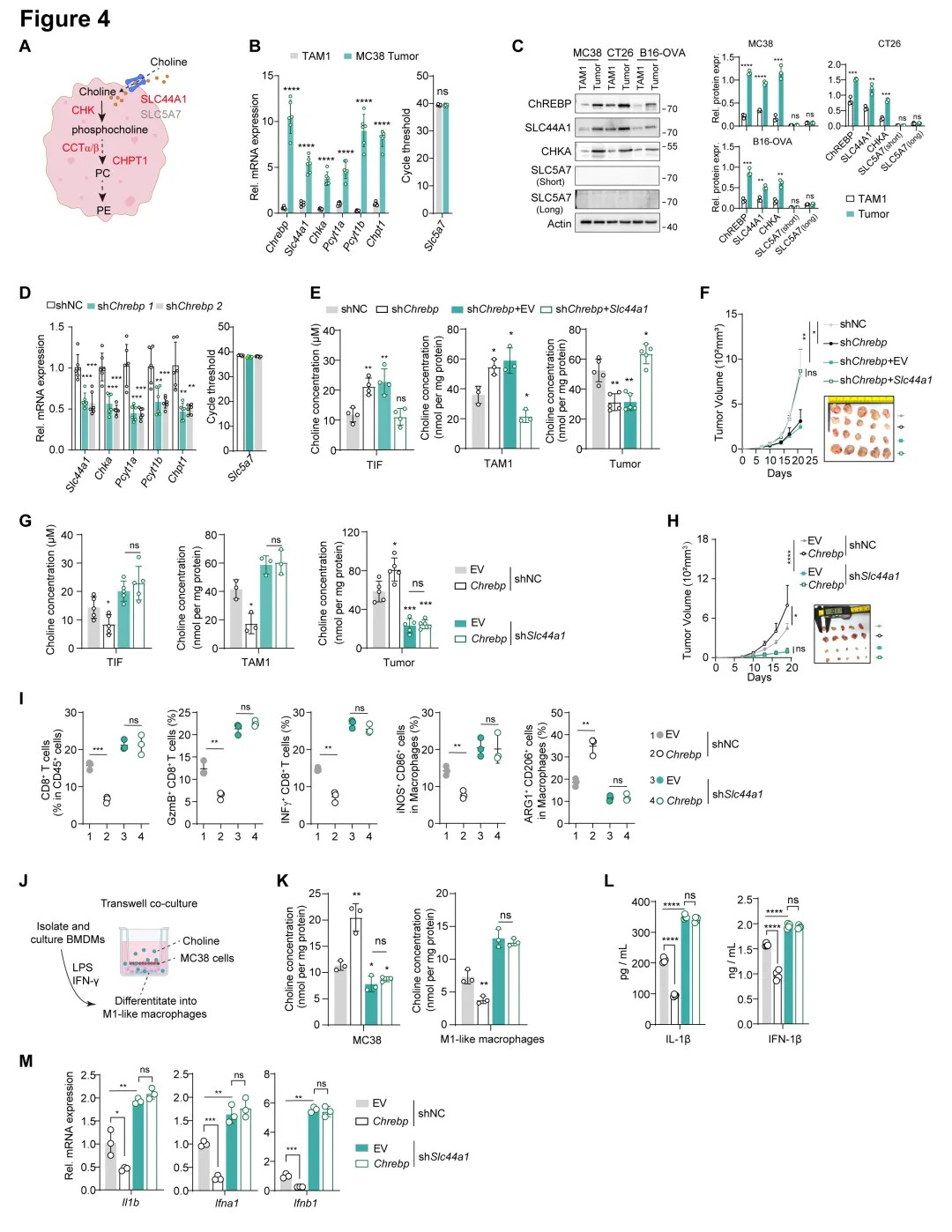 胆碱的体内获取主要依赖转运蛋白 SLC44A1 或 SLC5A7,作者通过对比 TAM1 细胞与 MC38 肿瘤细胞中关键分子表达,发现 MC38 细胞的 ChREBP 与 SLC44A1 基因表达水平显著高于 TAM1 细胞。进一步的体内外实验证实,肿瘤细胞可通过高表达 ChREBP/SLC44A1 复合物,与 TAM1 细胞竞争性摄取胆碱,实现对肿瘤微环境中胆碱资源的优先占据,为后续 TAMs 重编程奠定代谢基础。