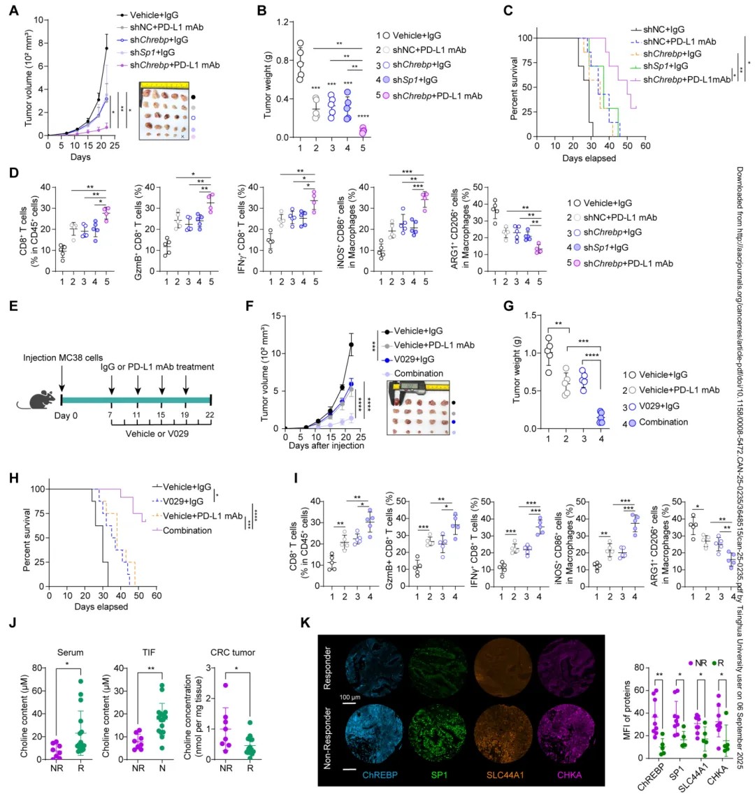 进一步通过检测结直肠癌(CRC)患者的胆碱水平与免疫治疗响应,不仅明确了 ChREBP 在肿瘤免疫逃逸中的核心作用,更凸显了靶向 ChREBP-SLC44A1 轴以增强结直肠癌免疫治疗疗效的临床转化潜力。