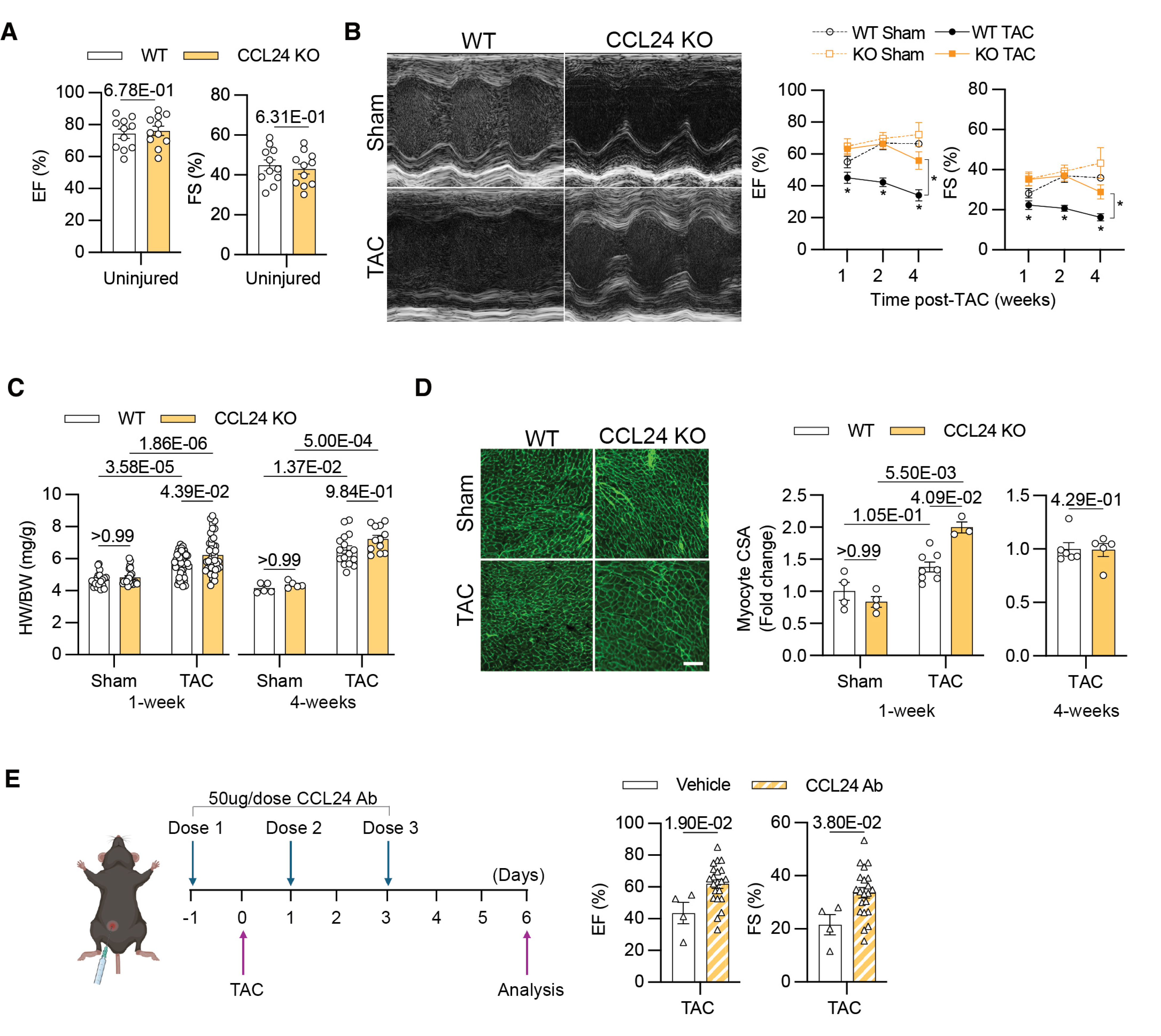 基于上述研究背景,本研究聚焦 CCL24 在急性压力超负荷诱导心力衰竭进展中的作用。研究发现,无论是 CCL24 基因缺陷模型,还是通过抗体介导的 CCL24 抑制策略,均能显著改善心脏功能,促进适应性心脏重塑,并减轻压力过载后的心肌纤维化程度。