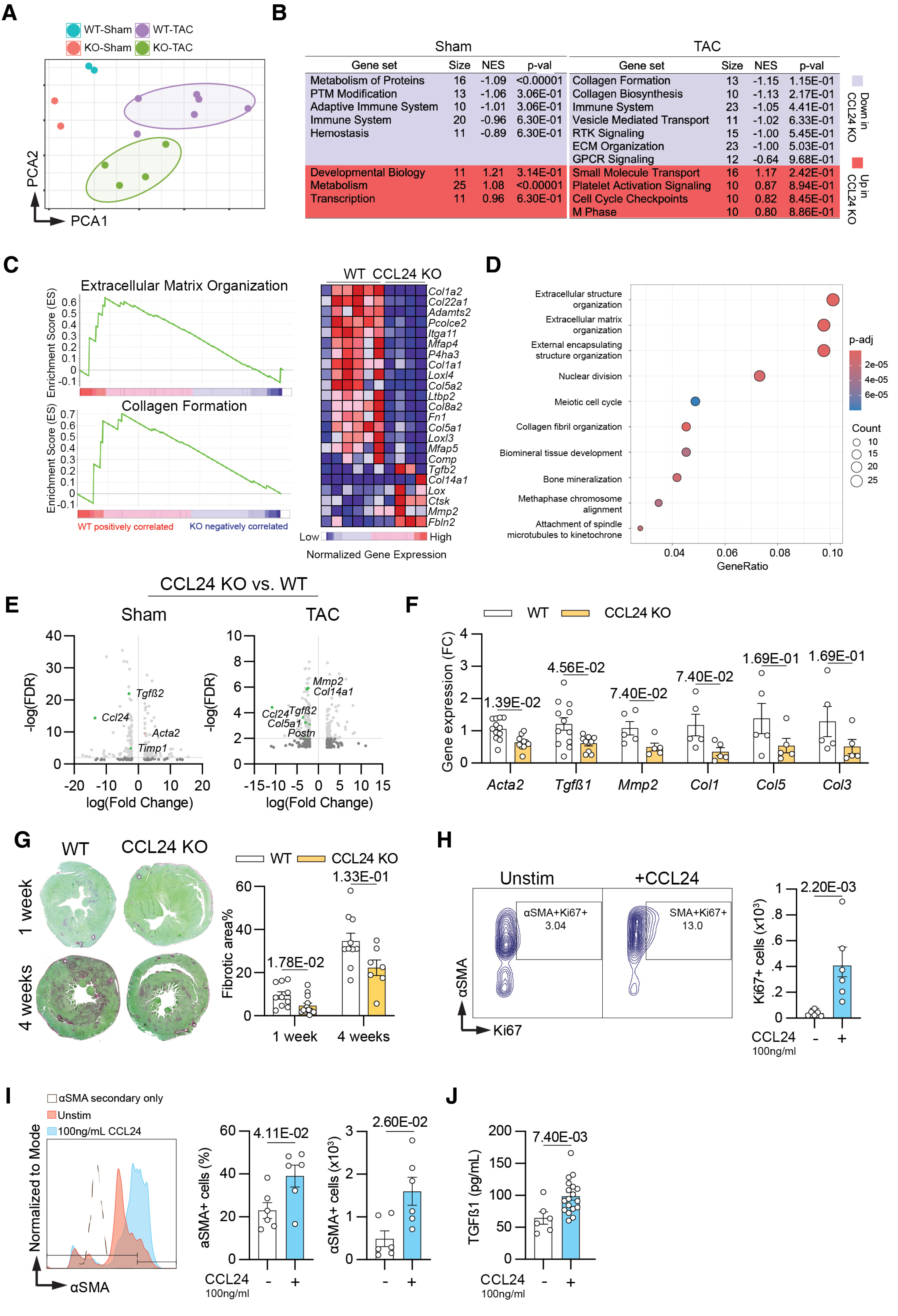 RNA-seq 测序分析结果显示,CCL24 缺失可显著下调胶原合成、细胞外基质(ECM)形成相关基因表达,同时抑制 TGF-β 信号通路激活,使促纤维化基因表达谱整体下调,最终导致心脏纤维化面积减少 40%。体外功能验证实验证实,重组 CCL24 蛋白可直接诱导成纤维细胞增殖,并促进 α- 平滑肌肌动蛋白(αSMA)及 TGF-β 的产生,明确 CCL24 通过直接激活成纤维细胞驱动心脏纤维化进程。