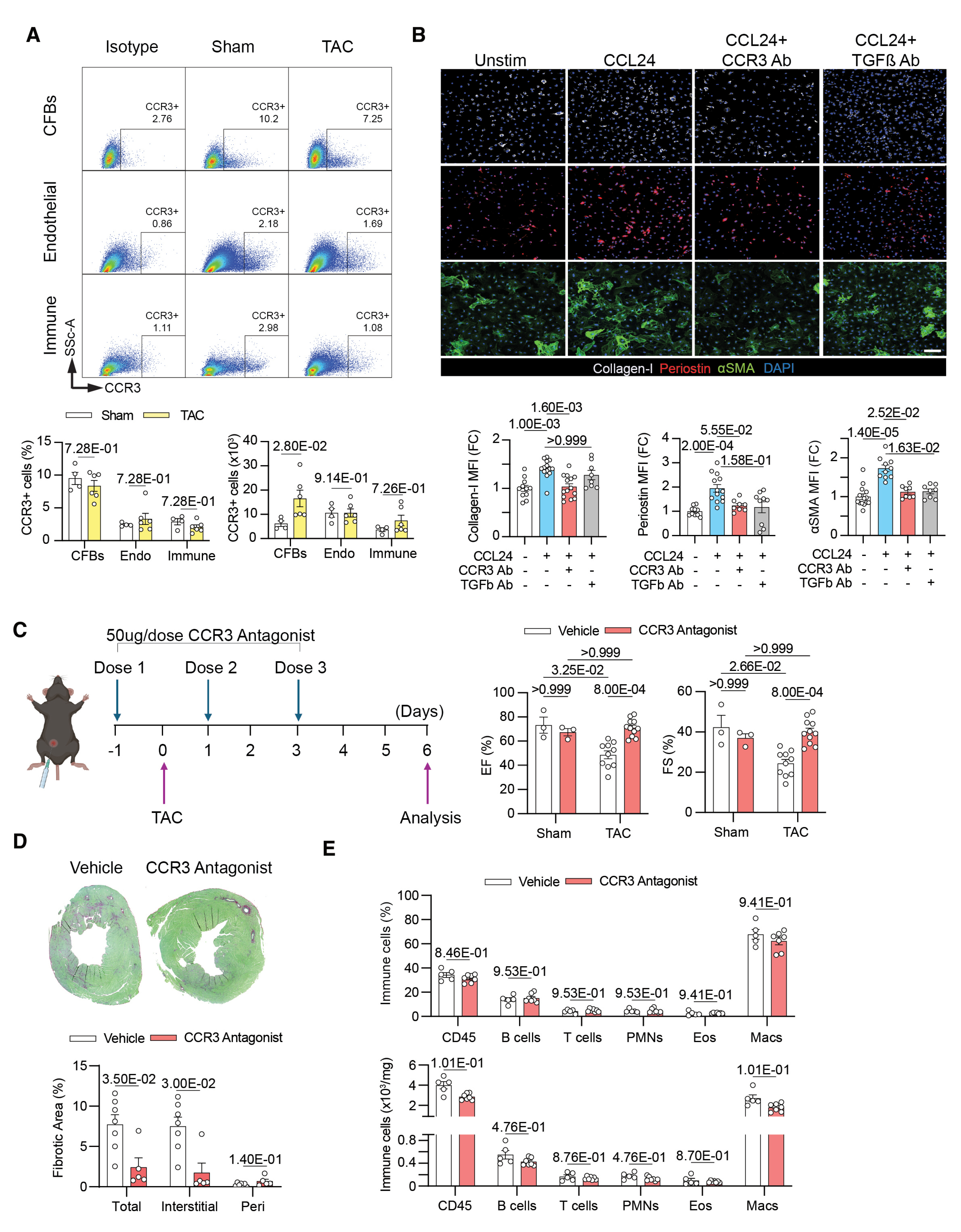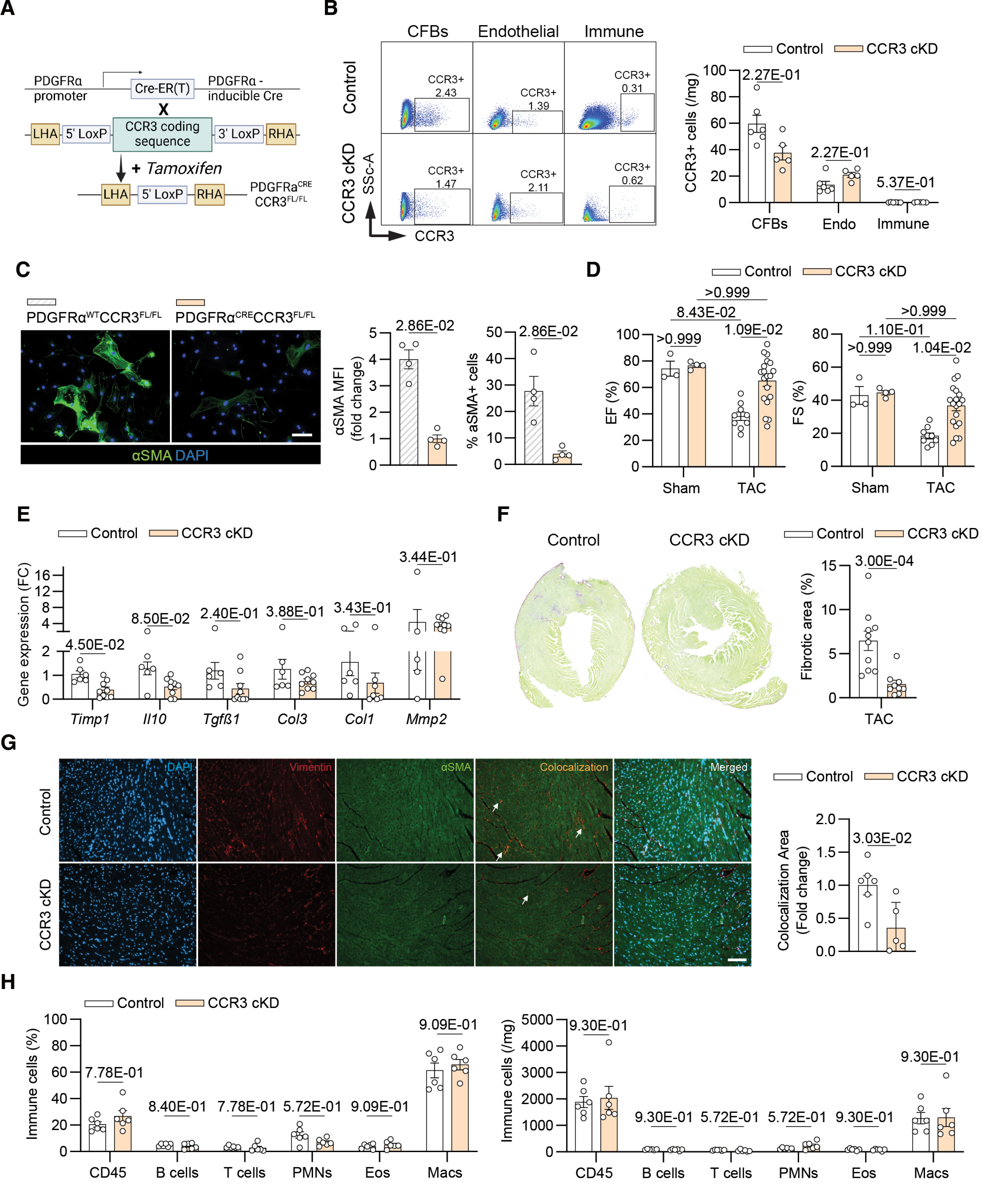 本研究构建成纤维细胞特异性 CCR3 条件性敲除小鼠(CCR3 cKD),经他莫昔芬诱导后,小鼠成纤维细胞中 CCR3 表达水平显著下调。在主动脉缩窄术(TAC)构建的压力超负荷模型中,术后 1 周检测显示,CCR3 cKD 小鼠的左心室射血分数(LVEF)和左心室缩短分数(LVFS)较对照组显著提升;纤维化相关标志基因(Col1、Col3、Timp1)表达显著下调,心肌组织胶原沉积量及肌成纤维细胞(α-SMA 阳性细胞)面积明显减少,心功能得到有效改善。进一步分析证实,上述心功能改善与纤维化抑制效应不依赖心脏组织免疫细胞浸润状态的改变,明确成纤维细胞表面的 CCR3 是介导 CCL24 促心脏纤维化作用的关键分子靶点。