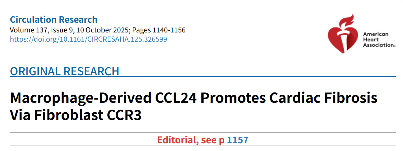2025 年 8 月,《Circulation Research》在线发表明尼苏达大学 Xavier S. Revelo 团队的突破性研究。该研究证实,CCL24 可通过结合成纤维细胞表面受体 CCR3,经下游 PI3K/AKT 信号通路直接激活成纤维细胞;而成纤维细胞中 CCR3 的遗传敲除,能在压力过载模型中显著改善心脏功能并减轻纤维化程度。研究明确,CCL24/CCR3 信号轴的激活在压力超负荷诱导的心脏纤维化与心功能障碍进程中发挥关键调控作用。