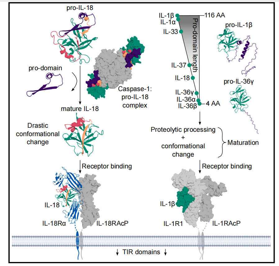 令人意外的是,这个新晋细胞因子与 IL-1 家族尤其是 IL-1β 渊源颇深:和 IL-1β 一样,IL-18 先以无活性前体形式合成,无信号肽,全程以细胞内细胞因子的状态存在。1995 年之后,学界通过中和内源性 IL-18、构建 IL-18 缺陷小鼠等实验,逐步证实 IL-18 在促炎症反应、调控免疫应答中扮演关键角色。