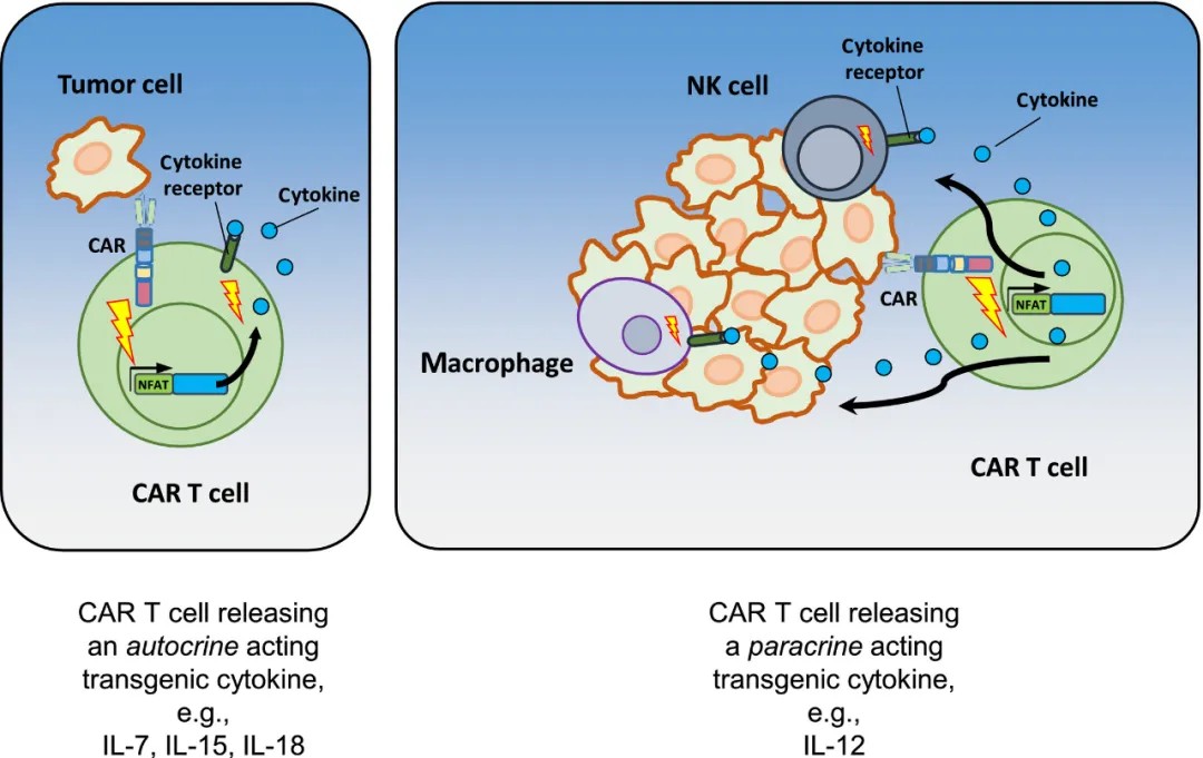 此外,在第四代 CAR-T 细胞(TRUCK CAR)的设计中,通过基因工程改造可使 CAR-T 细胞在发挥杀伤功能的同时,诱导分泌包括 IL-18 在内的多种细胞因子,进而通过旁分泌效应强化局部免疫细胞活化,提升 CAR-T 疗法的抗肿瘤效能。
