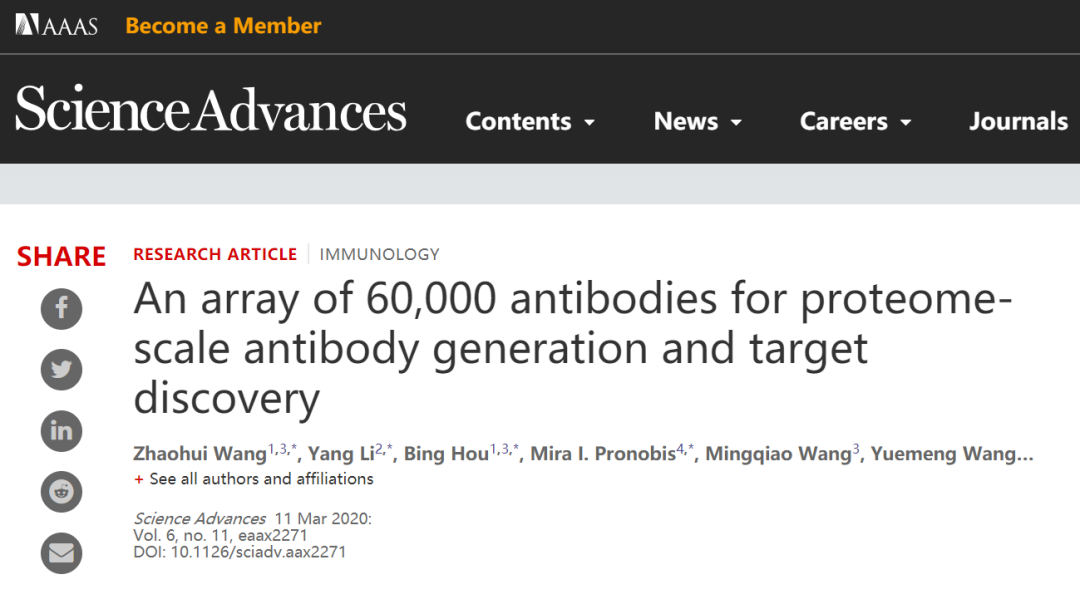 西北大学王朝晖课题组与上海交通大学陶生策课题组合作,于2020年3月11日在国际权威学术期刊《科学·进展》(Science Advances)上发表了题为“An Array of 60,000 Antibodies for Proteome-Scale Antibody Generation and Target Discovery”的研究论文。该研究成功构建了一个包含六万种抗体的高通量阵列平台,建立了覆盖蛋白质组规模的抗体资源库,为系统性蛋白质功能解析及分子靶标发现提供了重要技术支撑。此项工作标志着蛋白质组学工具开发取得了突破性进展,为后续大规模生物标志物筛选与功能研究奠定了方法学基础。