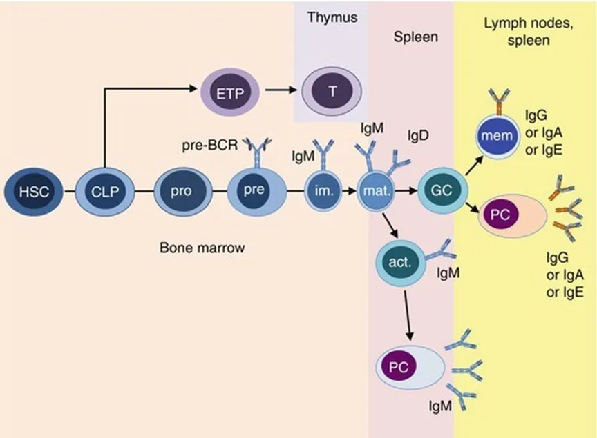 B细胞作为适应性免疫的三大淋巴细胞之一(另两类为T细胞和NK细胞),其命名源于1960-70年代的经典实验发现:Max Cooper和Robert Good通过手术切除鸟类的法氏囊(Bursa of Fabricius)后,发现鸡丧失了抗体产生能力,因此取该免疫器官首字母命名为"B细胞"。在人体中,B细胞起源于骨髓造血干细胞(HSC),其发育过程严格遵循基因调控的阶段性分化程序,最终形成具有抗原应答能力的成熟B细胞。
