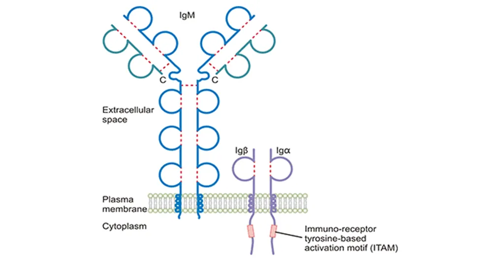 BCR是B细胞表面特异性识别抗原的核心分子,其结构与抗体的抗原识别区相似,赋予每个B细胞独特的抗原特异性。BCR由IgM重链和轻链组成,通过二硫键连接形成异二聚体,同时与跨膜复合物Igα/Igβ(CD79A/CD79B)非共价结合,构成完整的信号传导单位。BCR的胞内结构域与免疫受体酪氨酸激活基序(ITAM)相连,抗原结合后可启动下游信号传导,激活B细胞的增殖分化。 BCR具有双重生物学功能:一是特异性识别并结合抗原,通过内化作用将抗原加工为短多肽片段,再与MHC-Ⅱ分子结合呈递给辅助性T细胞;二是传递抗原识别信号,启动B细胞活化程序。BCR可变区的多样性由V(D)J基因重排产生,重排过程中碱基的随机插入、缺失及替换进一步增加了BCR库的多样性,确保机体能够识别众多不同结构的抗原分子。