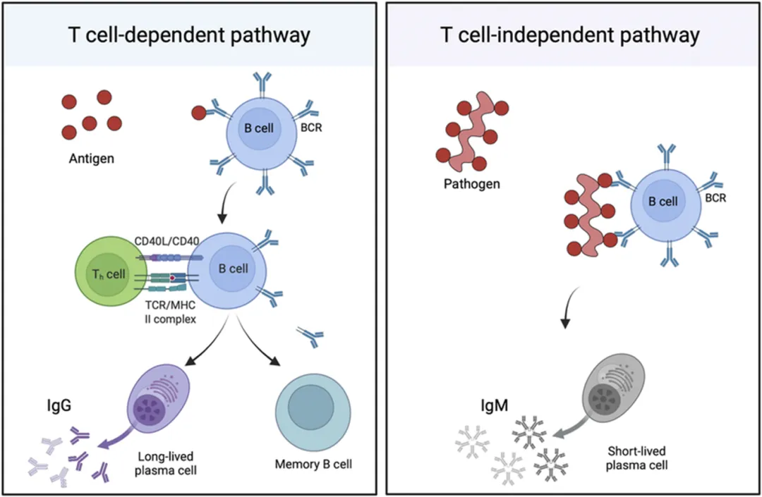 2. 非T细胞依赖途径:主要针对具有重复基序的大分子抗原(如细菌多糖),这类抗原可同时交联多个B细胞表面的BCR,无需辅助性T细胞参与即可启动B细胞活化。该途径通过BCR交联激活下游信号通路,诱导B细胞快速分化为短寿命浆细胞,仅产生IgM类抗体,不发生抗体类别转换和亲和成熟。其反应速度快,可在抗原入侵早期提供快速免疫保护,但免疫记忆维持时间较短。