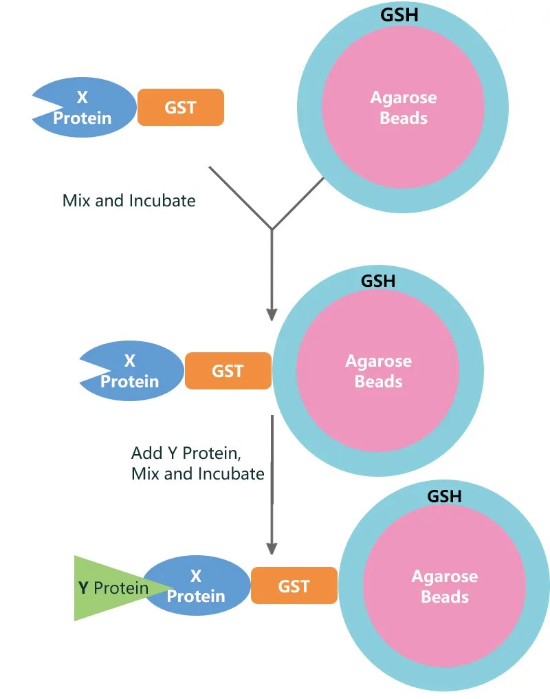 为提高实验的特异性和效率,常将目标"诱饵"蛋白与易于纯化的标签蛋白进行融合表达。其中,谷胱甘肽S-转移酶(GST)融合系统因其操作简便、纯化条件温和而被广泛应用。该系统基于GST与谷胱甘肽(GSH)间的高亲和力相互作用:首先将GST融合蛋白固定在偶联有GSH的琼脂糖树脂上,形成稳定的亲和界面;随后使含有待测蛋白的溶液流经该树脂,"诱饵"蛋白即可捕获溶液中与之相互作用的蛋白质。