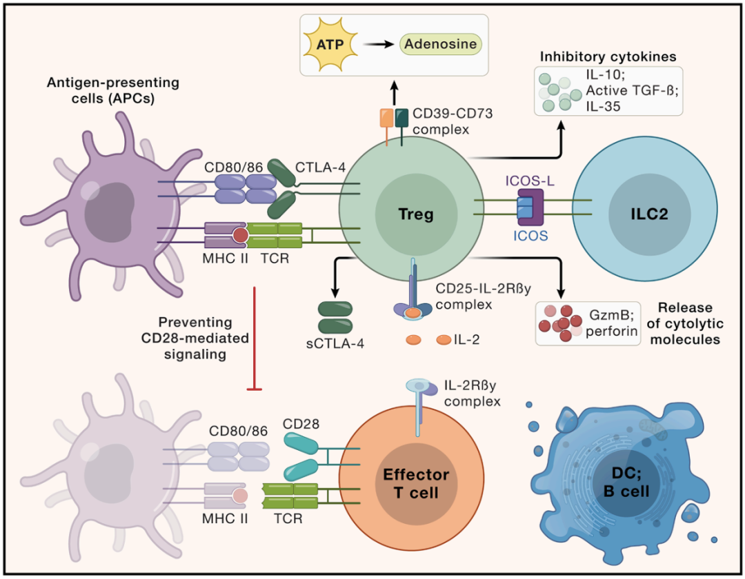 Treg 细胞通过直接的细胞间接触以及调节可溶性因子来抑制适应性免疫反应和先天免疫反应