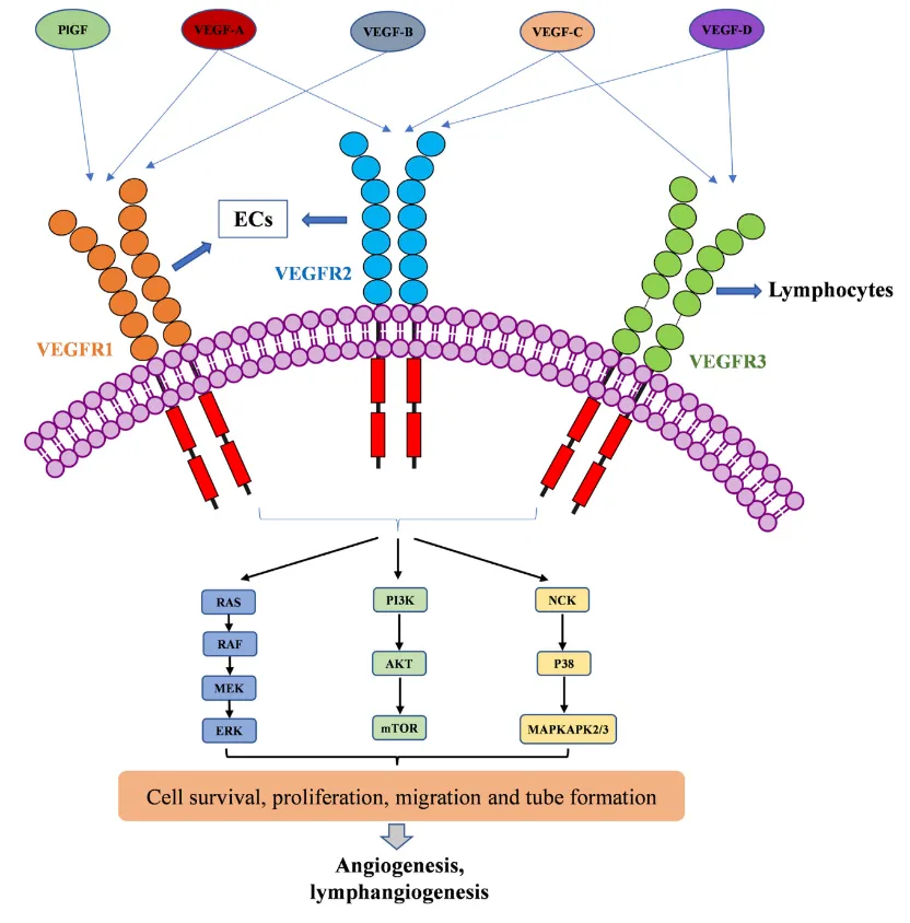 VEGFR-2:介导血管生成核心效应,配体结合后诱导二聚化与自磷酸化,启动下游信号。 - VEGFR-3:主要表达于淋巴管内皮细胞,结合VEGF-C/D后调控淋巴管发育与功能。