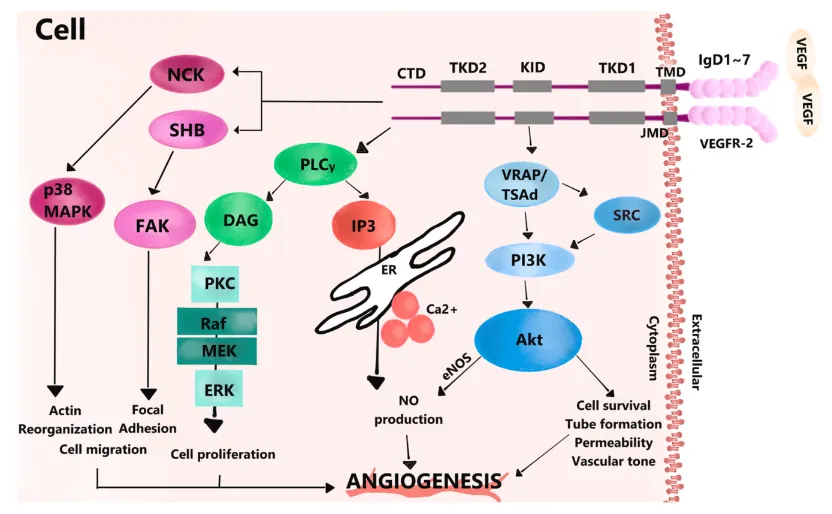 VEGFR-2 作为血管生成信号传导的核心枢纽,激活后可启动多条相互关联的下游信号通路,通过复杂的交叉调控与反馈机制,精确调控内皮细胞的生物学功能。