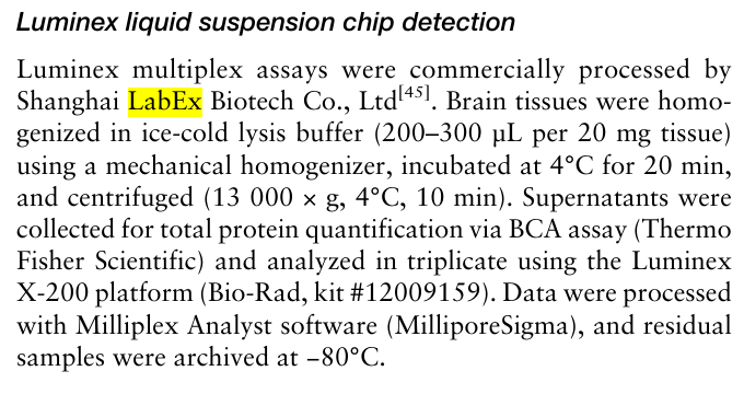 Luminex液体悬浮芯片测定法测定脑组织中细胞因子和趋化因子的水平。(n=5/组)。