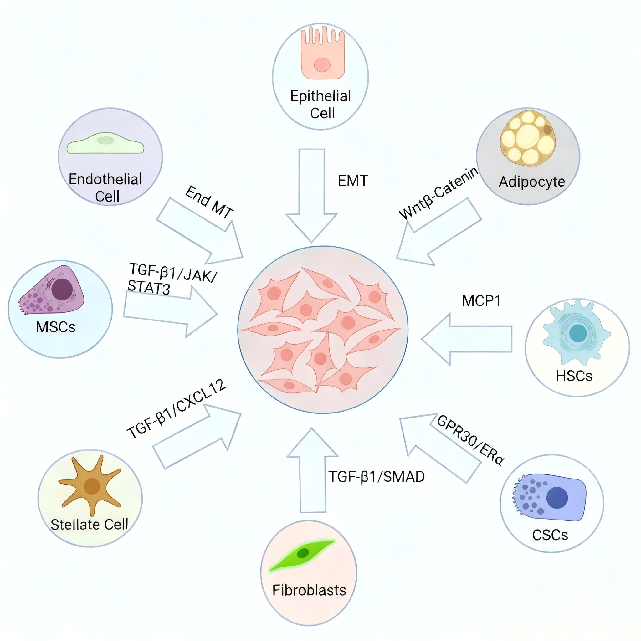 CAF的起源具有显著复杂性、多样性,且这种多元起源是其高度异质性的核心原因之一。目前研究证实,CAF可来源于多种不同的细胞类型,涵盖固有细胞与募集细胞两大类:固有细胞包括组织局部的静止态成纤维细胞、上皮细胞(经上皮-间质转化形成)、内皮细胞;募集细胞则包括骨髓来源的间充质干细胞(MSCs)、造血干细胞(HSCs)、癌症干细胞(CSCs),以及脂肪细胞、周细胞、星状细胞(如肝脏星状细胞活化后转化)等。