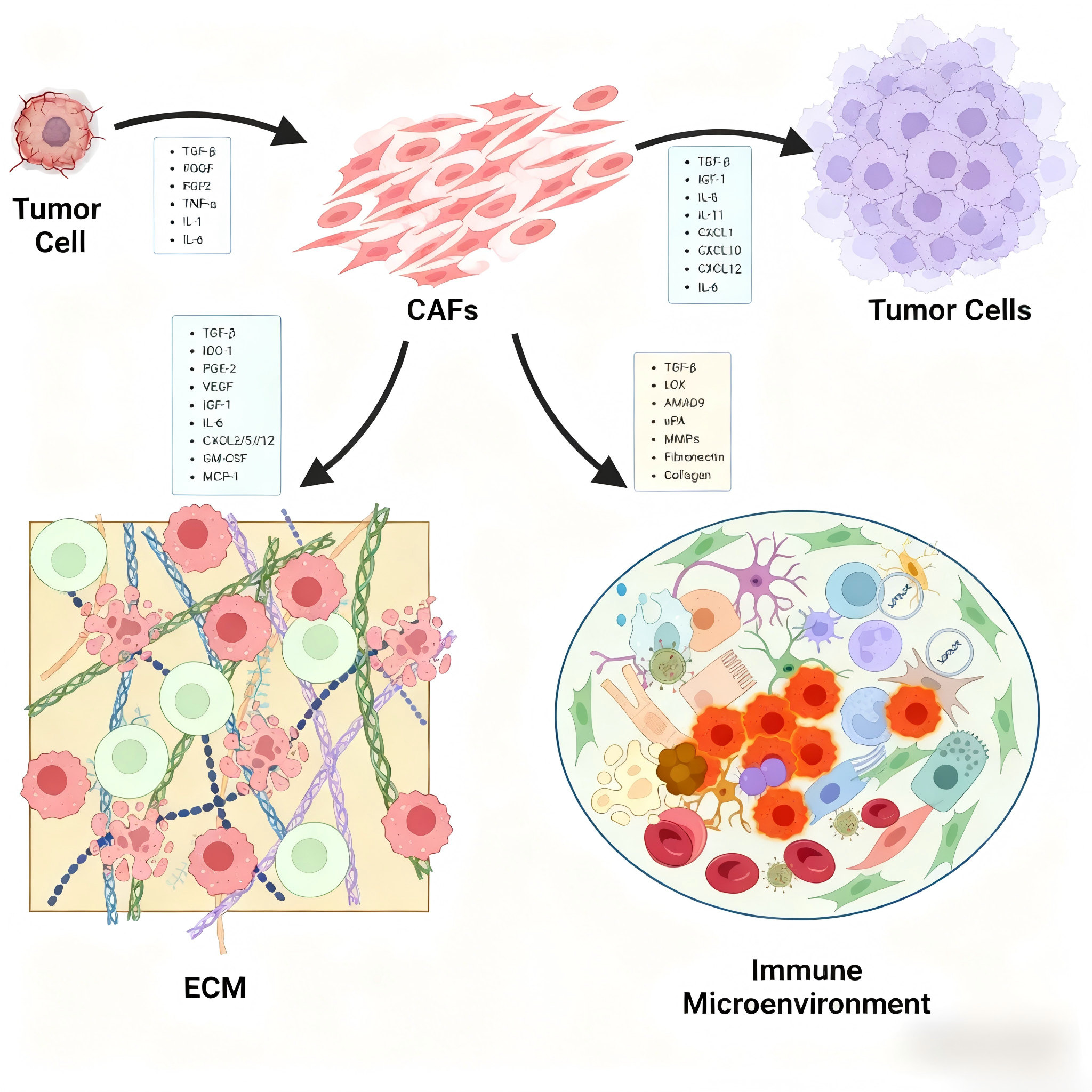 与正常成纤维细胞相比,CAF的促肿瘤活性显著增强,其不仅自身具备活跃的功能表型,还能通过与肿瘤细胞、免疫细胞、内皮细胞等微环境组分的动态交互,重塑肿瘤微环境的稳态,形成利于肿瘤进展的“促癌微环境”,加速肿瘤恶性演进。