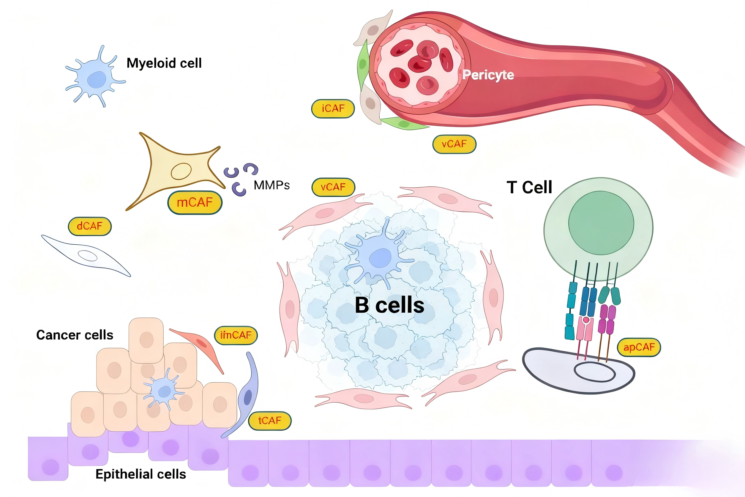 当我们谈论癌症时,很多人首先想到的是癌细胞的“无限增殖”能力,但实际上,肿瘤的恶性进展并非癌细胞的“孤军奋战”。在肿瘤周围的微环境中,存在一群被癌细胞主动“招募”或诱导“改造”的细胞群体,它们如同“帮凶”一般,通过多种机制助力肿瘤生长、侵袭扩散,并帮助其抵抗临床治疗。其中,癌相关成纤维细胞(CAF, Cancer-Associated Fibroblasts)作为肿瘤微环境中数量丰富、功能关键的细胞类型,是推动肿瘤进展的重要“共犯”。