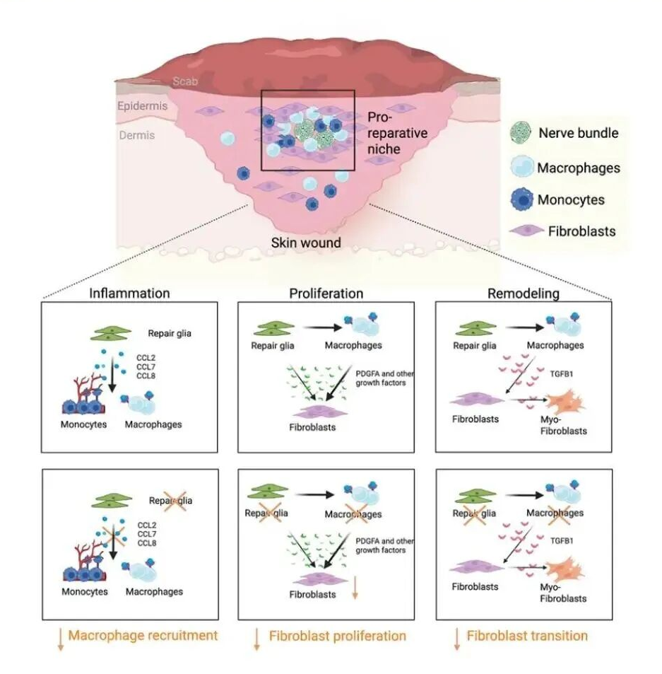 综上,外周神经修复型胶质细胞是皮肤伤口早期愈合的关键时空调控因子,其通过趋化因子招募巨噬细胞、调控成纤维细胞功能,构成核心调控网络。该发现丰富了伤口修复分子机制理论,提供了新的潜在靶点,兼具基础研究价值与临床转化前景。