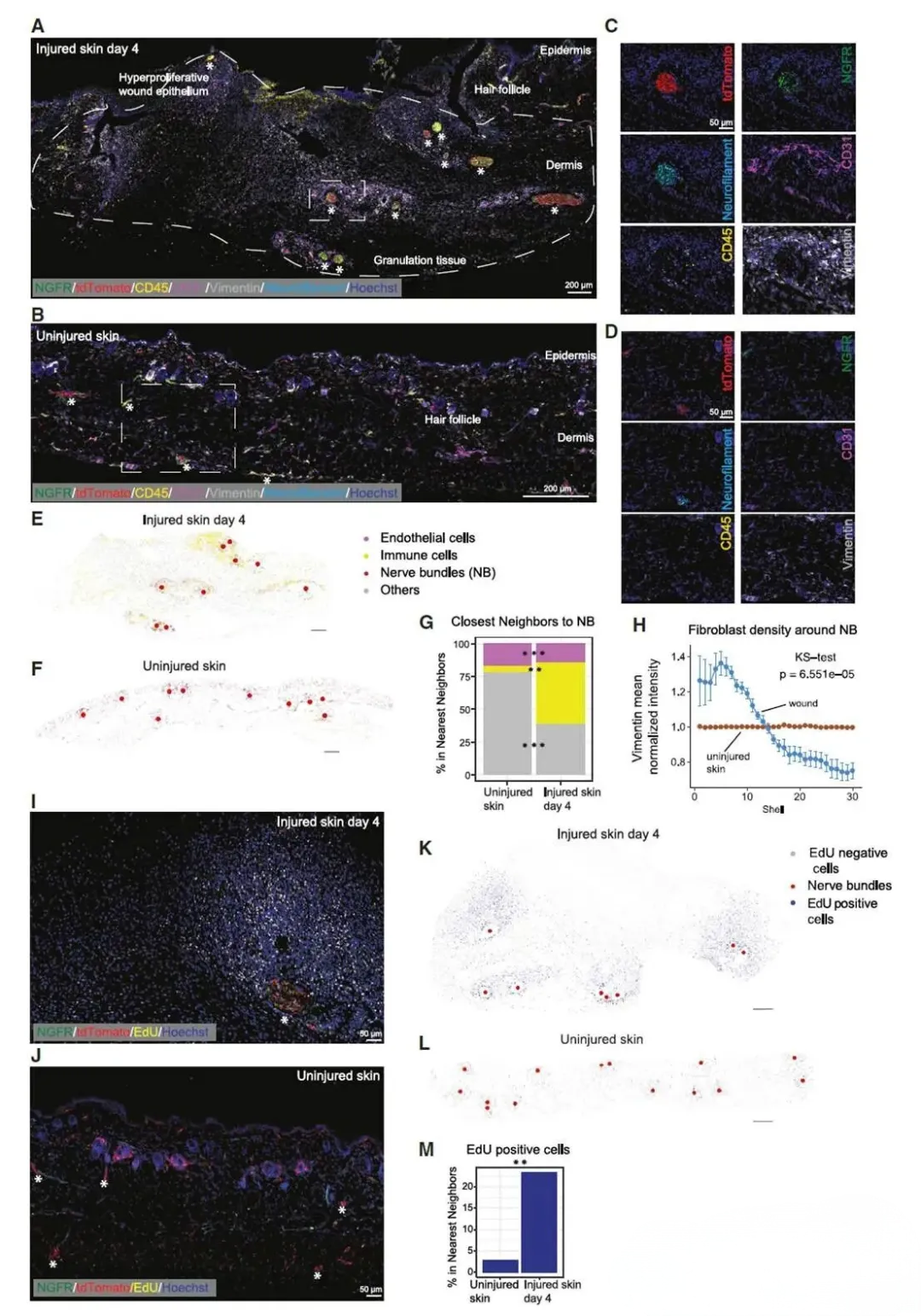 多重荧光成像结果显示,损伤后第4天,NGFR高表达的修复型胶质细胞主要聚集在创面内的神经束周围。与未损伤皮肤相比,创面神经束周围显著富集了成纤维细胞和CD45+免疫细胞,且EdU+增殖细胞数量大幅增加(p=6.551e-05)。Sholl分析证实,成纤维细胞密度与距离神经束的远近呈正相关,而未损伤皮肤中该细胞分布均匀,表明损伤早期以修复型胶质细胞为中心形成了富含增殖细胞和免疫细胞的"促修复微环境"。