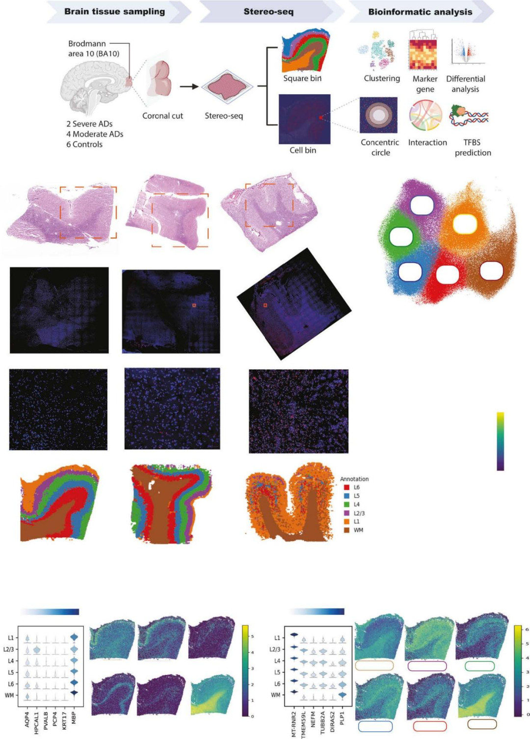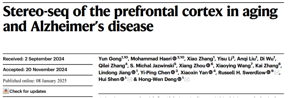 阿尔茨海默病(AD)是老龄化社会中最常见的痴呆类型,其病理机制复杂且与正常衰老的界限模糊,给临床诊疗带来巨大挑战。前额叶皮层(PFC)是 AD 病理损伤的核心脑区,传统研究手段难以同步捕获其分子表达特征与空间分布信息。本研究采用亚细胞分辨率的 Stereo-seq 技术,构建 AD 患者与年龄匹配对照者 PFC 的空间转录组图谱,系统解析皮层分层结构紊乱、细胞类型特异性转录变化及细胞间通讯异常,筛选出关键调控因子与神经保护模块,为区分 AD 与正常衰老、开发新型治疗靶点提供突破性见解。