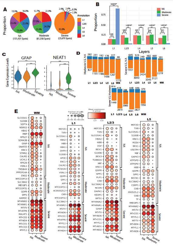 随着 AD 病情进展,皮层分层结构呈现显著紊乱:重度 AD 患者 L2-L6 层占比显著降低,L1 层占比由 13.9% 升至 22.9%,直观反映前额叶皮层的萎缩特征(图 2A-B)。星形胶质细胞激活标志物 GFAP 与 NEAT1 在重度 AD 组均呈高表达(校正后 P 值均为 0.0),提示 L1 层占比升高或与神经元降解及胶质细胞激活密切相关(图 2C)。差异基因分析显示,AD 组下调基因数量显著多于上调基因,且晚期上调基因多富集于线粒体功能相关通路,揭示 AD 进展过程中存在全局性线粒体功能障碍(图 2D-E)。值得注意的是,白质区域作为 AD 早期病变的敏感区域,在疾病早期即出现髓鞘维持基因 MBP、突触功能基因 SNAP25 的显著下调,提示白质病变可能是 AD 早期核心病理特征之一(图 2E)。