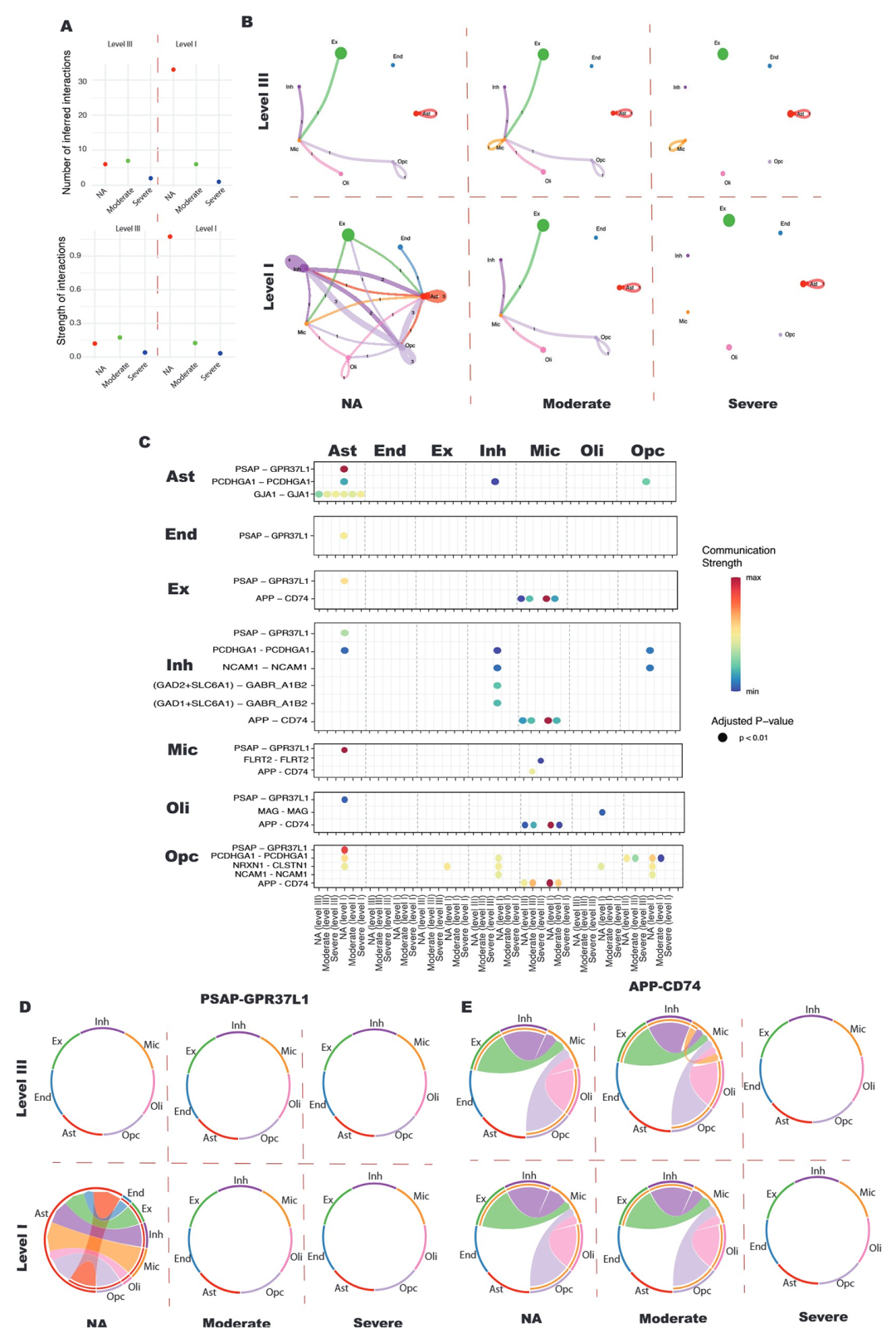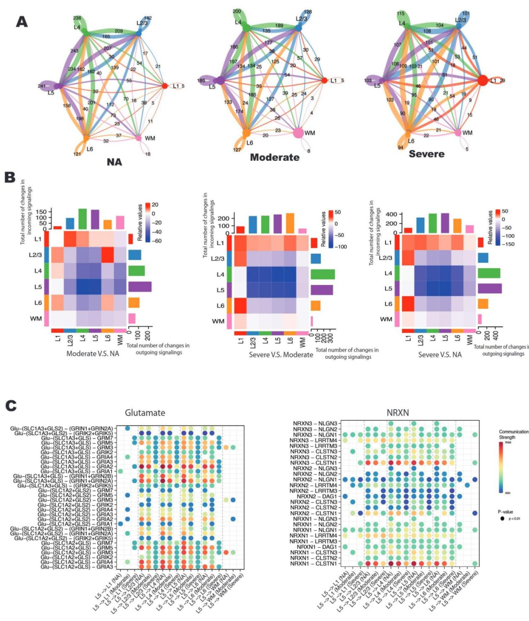 细胞通讯分析发现,AD 患者细胞间相互作用数量随病情进展持续减少,由正常衰老组的 3571 个降至重度 AD 组的 2244 个,直观呈现神经网络连接逐步崩溃的动态过程(图 3A)。热图对比结果显示,L4-L5 层间相互作用及 L4-L6 层信号输出显著减少;此类垂直网络是维持认知功能的核心结构,其破坏或直接诱发认知损伤(图 3B)。关键神经递质信号通路的损伤尤为显著:L5 层(主要输出层)向其他皮层分层传导的 SLC1A2-GRIA2(谷氨酸信号通路)、NRXN3-CLSTN1(突触分化相关)等核心配体 - 受体互作,在中度 AD 组显著减弱,至重度 AD 组则完全消失,这为认知衰退的分子机制提供了直接实验依据(图 3C)。