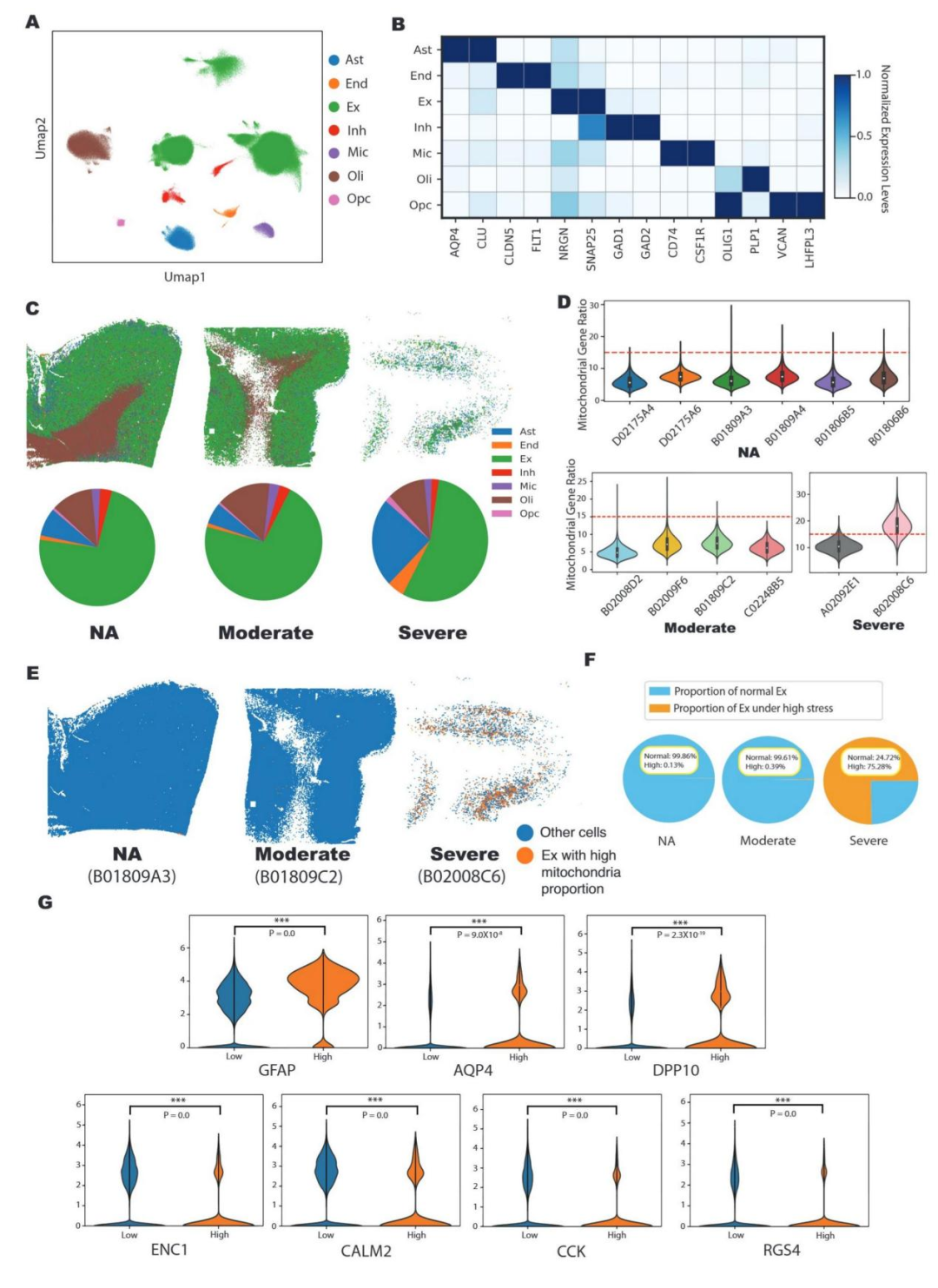 在 bin50 分辨率下,本研究注释出星形胶质细胞(Ast)、兴奋性神经元(Ex)等 7 类核心细胞类型,并明确 Ex 主要分布于新皮质、少突胶质细胞(Oli)富集于白质的空间分布特征(图 4A-C)。以线粒体基因占比≥15% 为判定阈值,研究鉴定出高应激 Ex 亚群:该亚群在重度 AD 组占比高达 75.28%,而正常衰老组仅为 0.13%,这一显著差异提示 AD 晚期神经元应激状态呈广泛性激活(图 4F)。高应激 Ex 所在区域同步高表达星形胶质细胞标志物GFAP、AQP4(校正后P值均为 0.0),表明神经元处于高应激状态时,邻近胶质细胞会被激活并向受损区域迁移,进而发挥潜在支持作用(图 4G)。差异基因分析进一步揭示高应激神经元的分子特征:MT-RNR2等线粒体相关基因表达上调,而ENC1、CALM2等神经保护基因表达显著下调(图 4G)。